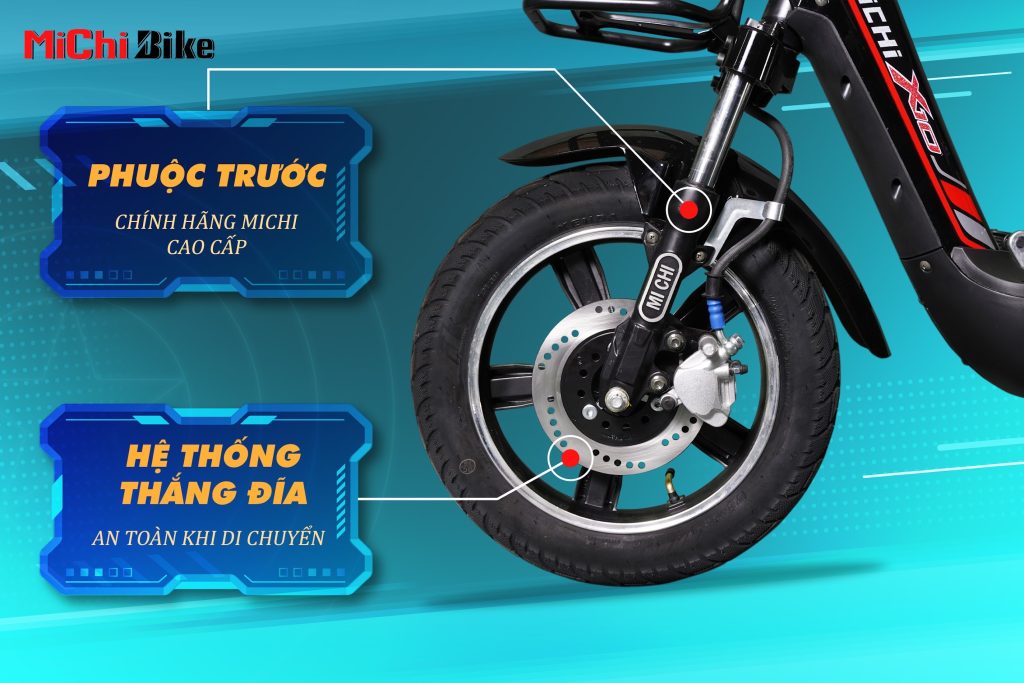 Bánh trước của xe thiết kế vành đúc nguyên khối cao cấp cực kỳ chắc chắn bao bọc bởi bộ lốp không săm siêu bền kích thước 16 inch cho khả năng bám đường tốt kể cả các đoạn đường trơn trượt, đường xấu. Cùng với hệ thống phanh đĩa cao cấp và phuộc trước dầu thuỷ lực đảm bảoxe luôn an toàn khi di chuyển.